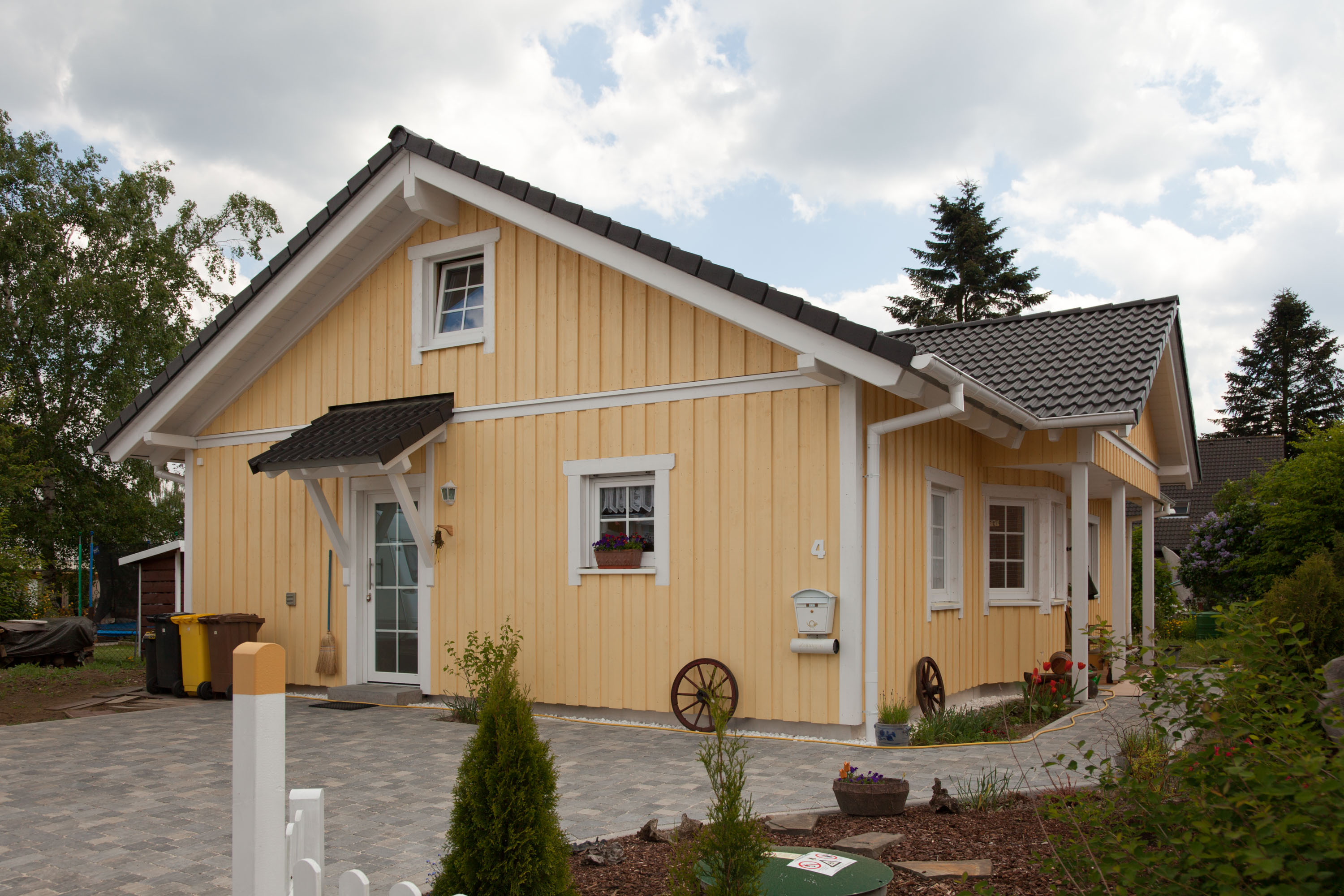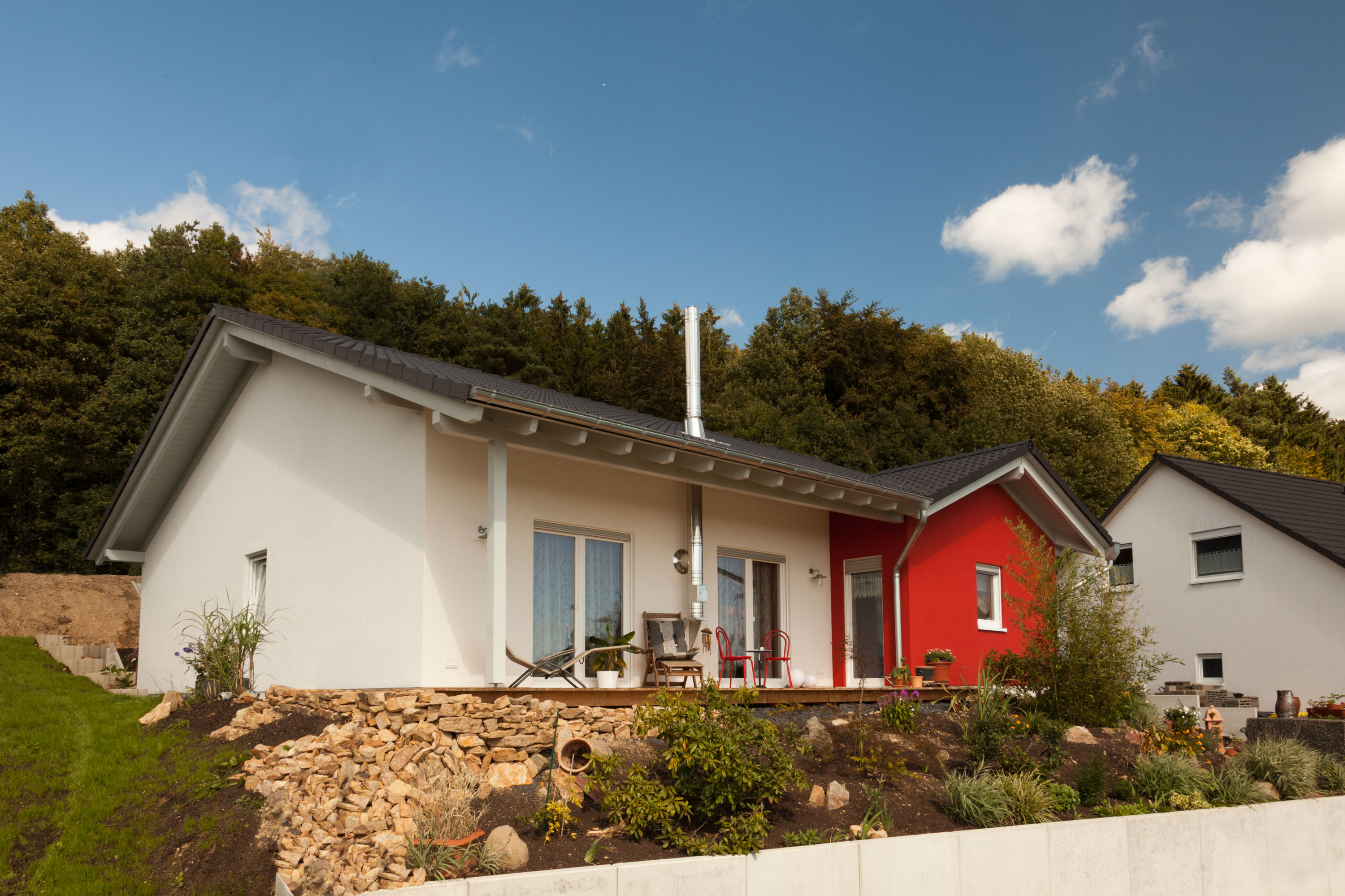 Von der Hausmontage bis zum Einzug vergehen bei einem schlüsselfertigen Bungalow etwa 6 Monate. Die Planungsphase ist dabei nicht eingerechnet. Durch die Vorfertigung im Werk reduziert sich die Bauzeit vor Ort erheblich, und Sie sind weniger von Witterungseinflüssen abhängig.