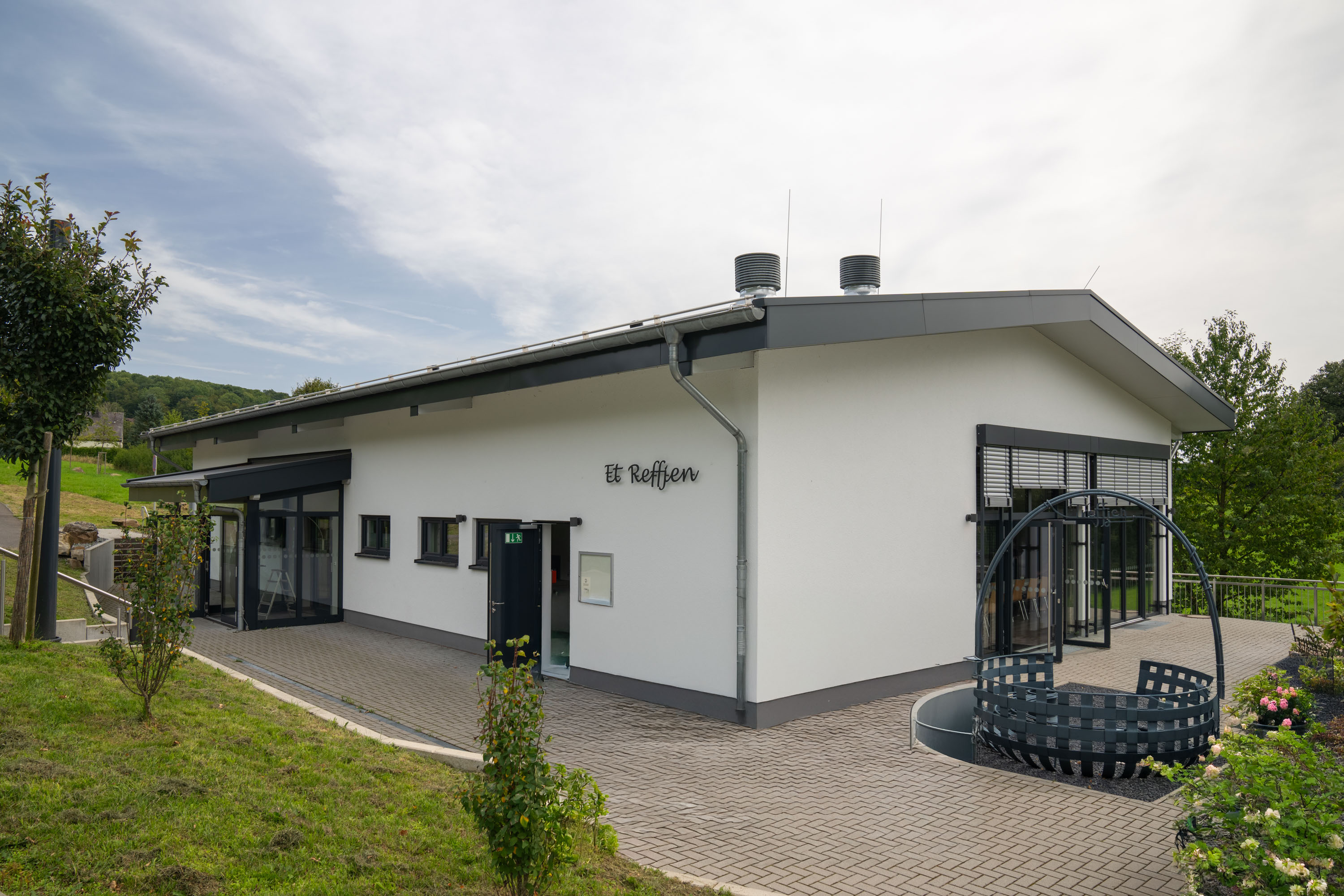 Ideal für ein geselliges, wetterunabhängiges Vereinsleben eignet sich die Grillhütte mit Lärchenschalung und großem, überdachtem Außenbereich. Viele kleine Feinheiten sorgen für einen geringen Wartungsaufwand und hohen Nutzwert.